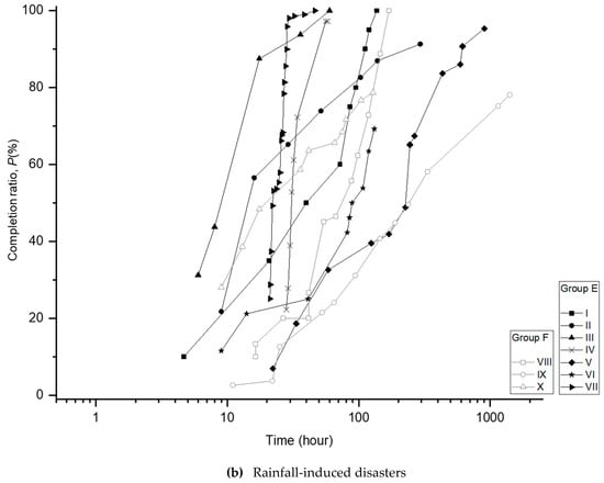 Following similar steps, Figure 10a,b was produced for rainfall-induced disasters. These cases lack details related to the SAR progress; hence, the results cannot be verified. However, it can be observed that the completion ratios were much lower than seen for earthquake cases having the same magnitude of death tolls. To further elaborate on the difference between these two kinds of disasters, Figure 11 is presented. Figure 11a presents cases of both disasters with fewer than 100 deaths, and Figure 11b presents cases with 100–1000 deaths. There can be seen a remarkable difference (in these figures) between the starting points of death curves for rainfall-induced disasters and earthquakes. Usually, the curves for earthquake disasters started after approximately 3 h on average, while those for rainfall-induced disasters started reporting casualties after approximately 10 h. It can also be seen in Figure 11 that the SAR time of rainfall-triggered disasters was longer than that of earthquake disasters. The low efficiency shown in Figure 10 and Figure 11 indicates the difficulty faced during relief operations following rainfall disasters. This can be attributed to challenges related to weather, communication, geographical location, and obstacles faced during SAR. The geographical locations of such disasters (usually adjacent to hillsides) and the persistent rainfall often cause the obstruction of traffic, thereby delaying the arrival of rescue teams. Large amounts of earth and stone need to be removed manually, causing more obstacles for rescue and lowering the SAR efficiency of such disasters.