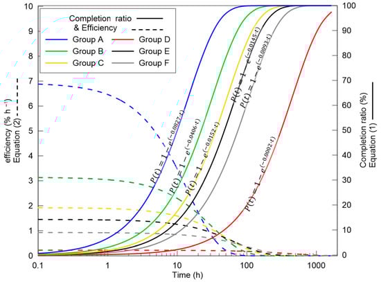 The regressions of all groups are presented in Figure 4, where the time-varying efficiency following Equation (2) is also presented. The values of the undetermined coefficient in Equations (1) and (2) are 0.0827, 0.0406, 0.0151, and 0.0002 for Groups A to D, respectively. The values of coefficient for Groups E and F are 0.0145 and 0.0093, respectively, indicating that rainfall-induced cases have a lower SAR efficiency when compared to the earthquake cases at the same level (Groups A and B).