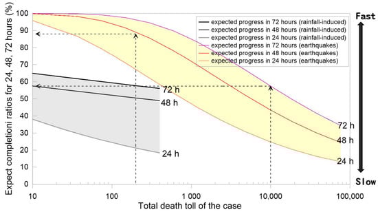 Time indicators are suitable for review after a disaster, while the other indicators are proposed to focus on the progress of the golden 72 h. Substituting t = 72 h into Equation (4a,b), as shown in Figure 7, illustrates the ideal completion ratio at 72 h. Following a similar procedure for the expected ratios at 24 and 48 h, progress indicators are also presented. When the death toll exceeds 10,000 people (for earthquake cases), theoretically, approximately 57% of the SAR work should be complete in 72 h; alternatively, when the death toll is approximately 200, theoretically, approximately 88% of the SAR work should be complete in 72 h.