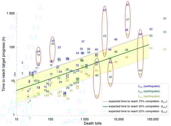 Taking earthquakes as an example, if X% in Equation (4a) is equivalent to 25%, 50%, or 75%, then, upon substituting the number of death tolls into NT, the time indicators of said 25%, 50%, and 75% can be obtained (Figure 6). If the practical time of the SAR work is shorter than the time indicator, the practical efficiency will be higher than expected. Inversely, if the practical time is longer, the practical efficiency will be lower than expected.