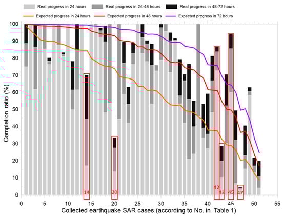 By applying data from 51 earthquakes (see Table 1) to Figure 6 and Figure 7, the SAR performance of each case could be determined, as shown in Figure 8 and Figure 9. Cases No. 43 (2018 Sulawesi, Indonesia) and No. 47 (2011 Honshu, Japan) had an obvious delay, as both of them triggered deadly tsunamis, affecting SAR operations and increasing the number of deaths. Among the events involving many casualties, tsunamis represented one of the secondary disasters with great impact on the SAR efficiency. In contrast, among cases with a higher death toll, the SAR efficiency of cases No. 42 (1999 Nantou, Taiwan) and No. 45 (2006 Java, Indonesia) was better than the rest, because these two cases were associated with mild secondary disasters. Statistical investigation of case No. 42 (1999 Nantou, Taiwan) shows that, within 24 h of the earthquake, fire rescue personnel spent 80–90% of their time undertaking earthquake rescue, with approximately 10% of their time devoted to the main accompanying disasters, e.g., fire disasters [22]. However, another case in Taiwan, i.e., No. 20 (2016 Tainan, Taiwan), showed inefficient results, with delays mainly occurring in the early stage. Referring to the scenes described in the media, local SAR personnel mentioned that the disaster relief team decided to manually break through upon the detection of life signals in one or two spots, but spent much more time than expected (i.e., requested 1 h but spent 10 h [18]), which explains the low efficiency. Additionally, in case No. 14 (2018 Hokkaido, Japan), 85% of the victims were buried by triggered collapses [23]; thus, this disaster may have similar characteristics in terms of SAR efficiency to rainfall-induced disasters (Figure 10). Case No. 49 (2003 Southeastern Iran) showed good efficiency in the early stage, but this worsened over time. According to Ibrion et al. [24,25], the SAR work organized by the government was slow, while the initial SAR was mostly executed by local residents [26]. Residents actively participated in the SAR work and mobilized community relief organizations, which is a major feature of emergency disaster management in developing countries [21]. Generally, Figure 8 and Figure 9 show similar functions and are consistent with the above case details; however, Figure 8 provides an efficiency assessment of the whole SAR process, while Figure 9 focuses on the first 24, 48, and 72 h, which are considered crucial for saving lives.