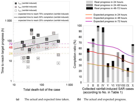 The calculated time and progress indicators of rainfall-induced disasters are shown in Figure 6 and Figure 7, respectively. Comparing the two disasters shows that, under the same magnitude of death toll, rainfall-induced cases require 5–7-fold more time to reach the same progress seen for earthquake cases (as shown in Figure 6). The expected completion ratios at 24, 48, and 72 h for rainfall-induced cases are lower than those for earthquake cases, (e.g., for approximately 200 deaths, approximately 57% of the SAR work is expected to be complete for rainfall-induced cases, compared to the 88% for earthquake cases).