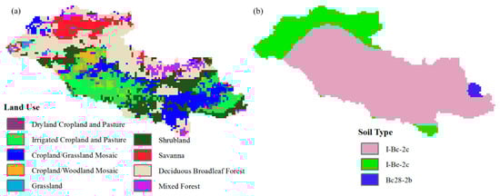 The soil type map at a 1:5,000,000 scale was obtained from the Food and Agriculture Organization (FAO) of the United Nations. Only three soil types in the basin could be obtained from the data set (Figure 2b). The number of soil types is small, and the main type is soil I-Bc–2c with a percentage of 78%. Soil I-Be–2c mainly characterizes the mountains upstream at high elevations.