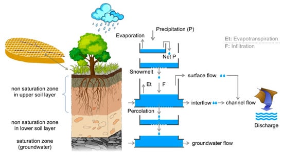 A physically based rainfall-runoff model, TOPKAPI (TOPographic Kinematic Approximation and Integration) [21,34,35], was used for deterministic flood forecasts in the study basin. TOPKAPI uses three ‘structurally-similar’, zero-dimensional, non-linear reservoir equations to represent the drainage in the soil, the overland flow and the channel flow. The TOPKAPI structure is model lumping, preserving the process’ non-linearities and retaining the physically meaningful parameters. This enhances the model’s practicality in basins with low-quality data that cannot meet the requirement of fully distributed hydrological models, e.g., the Systeme Hydrologique Europeen (SHE) model [36,37]. The TOPKAPI parameters are reported as scale-independent and could be determined from digital elevation maps, vegetation or land use maps and soil type maps in terms of slopes, soil permeability, topography and surface roughness. The runoff production and routing processes are described on grid scales. The study basin is divided into several square grids and the calculation of runoff generation is conducted at each grid cell. Thus, the spatial variabilities of meteorological inputs (e.g., precipitation and air temperature) and model parameters could be considered. TOPKAPI is developed based on the saturation-excess runoff mechanism and includes five basic components, namely evapotranspiration, snowmelt, surface flow, interflow and channel flow (Figure 3). The model assumes that soil water percolation towards the deeper subsoil layers does not contribute to the basin discharge. It is acceptable for flood forecast cases because the response time of deep aquifer flow is so large for one specific storm event in a catchment. The percolation rate from the upper soil layer is assumed to increase as a function of the soil water content according to an experimentally determined power law [21].