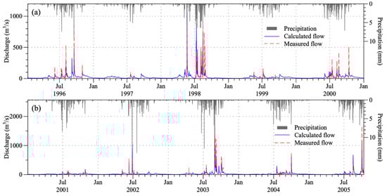 Calculated and measured hourly discharge time series at the Lushi station for the calibration period: (a) 1996–2000, and (b) 2001–2005.