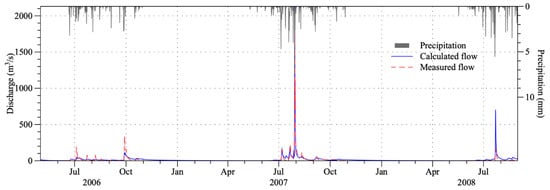 Figure 4 shows the comparison of calculated and measured hourly discharges at the Lushi station for the calibration period 1996–2005. It was found that the observed discharge data were available only during the flood season (June–October) and, in general, they were not continuous, with many missing data. Besides, the hydrological behavior seemed to change a lot among these flood seasons. For example, there was a greater percentage of rainfall-runoff loss in the period 2001–2005 than in the period 1996–2000. This leads to the difficulties of parameter calibration. Table 4 shows the statistics of model performance indices. Overall, the model performance in the validation period 2006–2008 was better than in the calibration period 1996–2005 in terms of all four evaluation indices. From the perspective of a single flood season, some flood seasons, such as the years of 1997 and 2001, had the worst model accuracy with an NSCE statistic less than zero. In general, the model was applicable to capture changes in the flow process during the flood season in the Lushi basin. Considering the lack of some hydrometeorological data and underlying surface data, there should be a large uncertainty in model input. Therefore, the model accuracy in this case was basically acceptable.