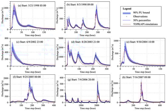 We also presented the model performance of eight flood events in Figure 6. The deterministic results of these flood events were produced by the TOPKAPI model as shown in Figure 4 and Figure 5. The HUP model was used to analyze the total forecast uncertainty of the deterministic results using the leading time of one hour. In the deterministic forecast results, the relative bias of flood peak (RBP) in five flood events satisfied the requirement of , and the average absolute value of RBP in all eight floods was 25.4%. In terms of relative bias of flood volume (RBV), the simulation results of three floods satisfied the accuracy requirements (), while the NSCE values of the selected flood events were greater than 0.75, except for the 2006 flood season.