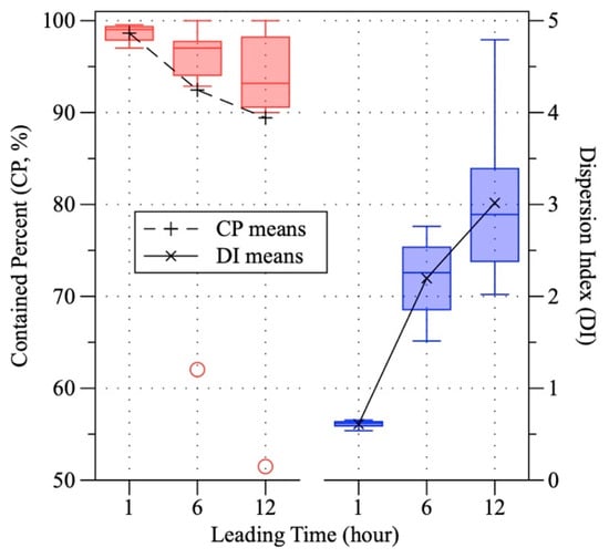 Changes in the Contained Percent (CP) and Dispersion Index (DI) statistics with the increase in forecast leading time for the selected eight flood events in the Lushi basin.