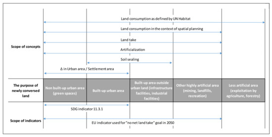 A clear conceptualization of the terms land consumption and land take is not only of academic interest but of high practical and political relevance. It is essential for effectively exchanging knowledge on spatial governance nationally and internationally, and also for compatible monitoring and reporting, which in turn impacts the credibility of quantitative policy targets [19,20] (p. 45). A need for clarification and guidance has been highlighted repeatedly see, e.g., [19,21,22], and with regard to the EU policy context, it has been pointed out how: “to date, there is a lack of harmonised terminologies across [EU] M[ember] S[tates] to describe issues related to the development of artificial areas as well as a lack of consensus regarding how to assess their environmental and socio-economic impacts and how to define compensation” [20] (p. 56 and footnote 23). The following paragraphs outline the two internationally agreed indicators used in this context.