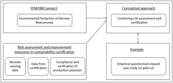 The fields of environmental footprint modelling, sustainability certification, and remote sensing analysis are closely interconnected. Their common reference is the risk analysis and identification of risk factors. At present, they are not yet well connected. However, the integration of these three approaches is promising to better monitor the sustainability of the BE. The three approaches can be brought into a hierarchical order forming an integrated sustainability risk analysis for certification. Data collection from all three concepts provides respective information on each hierarchical level in order to enable an integrated risk analysis.