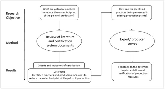 The presentation of our results is structured into four sub-chapters. Starting with results obtained from the literature review on indicators used in sustainability certification (Section 4.1) and the basics for an integrated sustainability risk analysis in palm oil production are described (Section 4.2). Afterwards, improved production measures concerning risks connected to water, land and biodiversity in palm oil production are listed in Tables 2–4 (Section 4.3). Based on these agricultural best-practice measures the questionnaire was designed and sent to palm oil producers. The results are presented in Section 4.4, containing the spread of certification systems, the feasibility of implementation of best practices on the producer’s site, and additional information for the implementation of the suggested production measures.