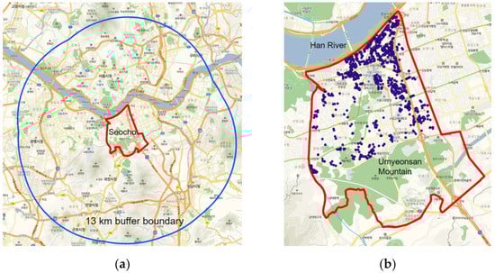 Study area and the distribution of apartments: (a) Seocho-gu boundary (red line) and the 13 km buffer boundary (blue line) of the visible range of viewshed analysis; (b) the locations of apartments used for the study (blue points).