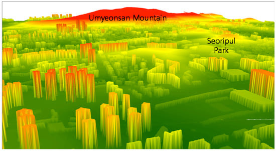 In Korea, various kinds of spatial information are distributed through the National Spatial Data Infrastructure (NSDI). In the study, the DEM, building, and land cover information from the NSDI’s spatial information distribution site [] was used. A digital surface model (DSM) with a 2-m resolution was constructed using the DEM for Seoul and neighboring areas as well as the height values of the building map (Figure 2). The view of each land cover was analyzed to evaluate the landscape using the sub-class land cover map (2-m resolution) for Seoul and the mid-class land cover map (10-m resolution) for the neighboring regions. Land cover classes such as paddy fields, fields, broadleaf forests, coniferous forests, mixed forests, natural grassland, artificial grassland, and barren land were extracted for evaluation of natural landscape views, and inland wetland and inland water items were extracted for evaluation of the view of the Han River.