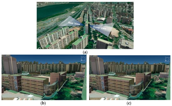 Front and rear views of an apartment in Seocho-gu, Seoul []: (a) two views of an apartment; (b) Part of the front view of (a); (c) Part of the rear view of (a).