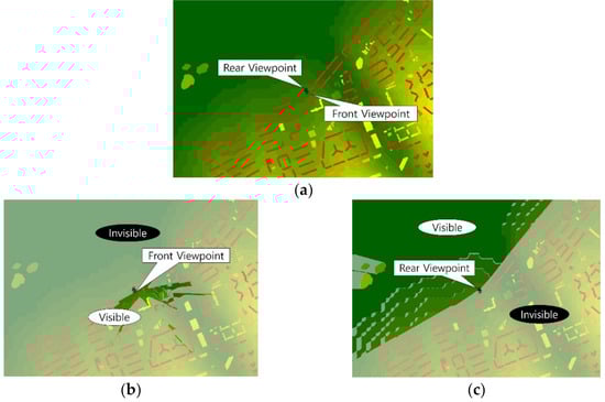 Example of viewshed analysis results: (a) Viewpoint overlay with the DSM; (b) Viewshed analysis result of front view; (c) Viewshed analysis result of rear view.
