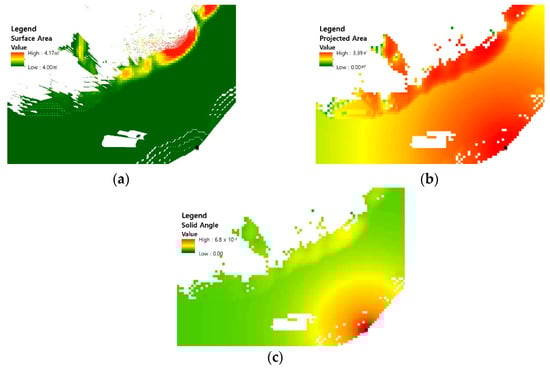 Example of the calculation result for the rear viewpoint in Figure 4: (a) surface area; (b) projected area; (c) solid angle.