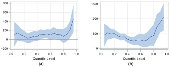 Quantile regression minimizes weighted absolute deviations to estimate conditional quantile functions []. For the median (τ = 0.5), symmetric weights are used; for all other quantiles, asymmetric weights are used []. The standard errors of coefficient estimates can be feasibly estimated using bootstrapping [].