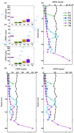 The average contents and the vertical distribution of LREE, HREE, and total REE in six soil profiles are presented in Figure 2. The average ∑REEs (total REE contents) of samples from different profiles are 201.45, 42.19, 29.68, 78.51, 133.06, and 22.96 mg kg−1, respectively. It is obvious that average REE contents of samples from soil profile T1 are higher than those from other profiles. The total REE contents of samples from soil profiles T2, T3, T4, and T6 are relatively low, much lower than that of Earth’s crust (153.80 mg kg−1) [34]. Vertically, the contents of light REEs, heavy REEs, and total REEs tend to increase slightly with depth in all six soil profiles. The LREE contents of all soil samples account for a large part (>87%) of total REE contents, which is consistent with the distribution characteristics of REEs in the Earth’s crust [35]. In the soil profile T5, the highest REE contents were found at the bottom, much higher than those of other samples (Figure 2). The bottom of T5 reaches the boundary between the bedrock and soil, where the weathering for the rocks is the strongest in the whole profile. It denotes that the weathering processes might exert essential influence on the behavior of REEs under natural conditions. During weathering, many chemical elements (including REEs) are released with the breaking up of minerals, which is beneficial for the accumulation of soil REEs [36,37,38]. Meanwhile, the leaching of REEs also contributes to the phenomenon that REE contents tend to increase with soil depth. The Mun River Basin has relatively heavy rainfall every year [16], which would improve the leaching processes of REEs in soils.