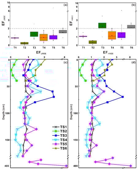 Box charts and vertical distributions of enrichment factors for LREEs and HREEs in six soil profiles. Some data are omitted because they are in small ranges of variation. (a,b): Box diagrams of the enrichment factors for LREEs and HREEs in six soil profiles; (c,d): Vertical distributions of the enrichment factors for LREEs and HREEs in six soil profiles.