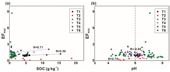(a) Correlation between soil organic carbon (SOC) and enrichment factors of total rare earth elements. (b) Correlation between soil pH and enrichment factors of total rare earth elements. Data from [17].