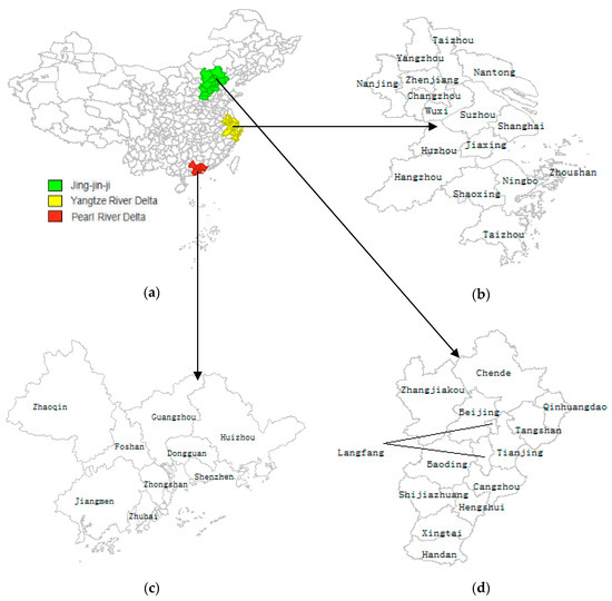 Location of the Yangtze River Delta, the Pearl River Delta, and the Beijing–Tianjin–Hebei urban agglomeration. (a) Location map of the three major urban agglomerations; (b) map of the Yangtze River Delta; (c) map of the Pearl River Delta; and (d) map of the Beijing–Tianjin–Hebei region.