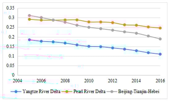 The σ coefficients of Yangtze River Delta, Pearl River Delta, and Beijing–Tianjin–Hebei.