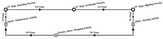 In the diagram presented above, there are six stages that comprise three trips. The first trip consists of four stages between two activities maintenance at home and work at the office. The second trip covers only one stage between work and shopping activities. Finally, the third trip is also defined by one (6th) stage and connects shopping and maintenance (at home) activities. If the shopping is not taking place for longer than 90 min, there will be two trip chains: First from home to work and second from work to home. Otherwise there exists only one trip chain—between home and work. All six stages form three trips and two trip chains comprise a single tour that starts and ends at home. An ordered list of activities (Maintenance, Working, Shopping, Maintenance) constitute the activity sequence.