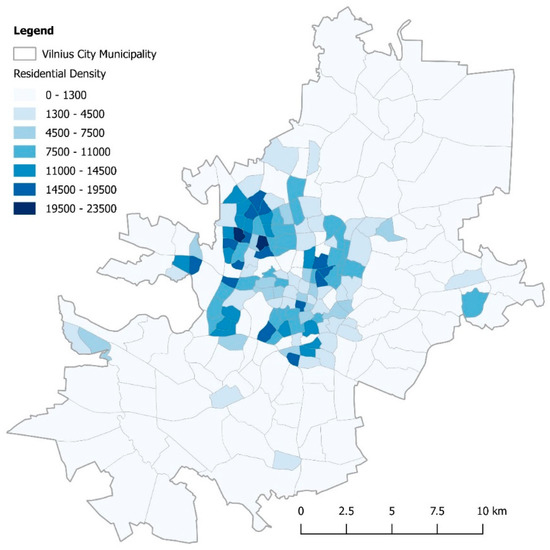 The area of Vilnius City covers 403 km2 in total and bearing in mind the number of residents reported above, it has a density of approximately 1320 residents per square kilometer. The following illustration in Figure 2 also contains a more detailed visualization of residential density within the administrative boundaries.