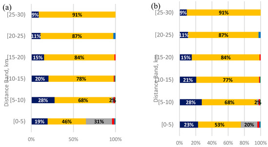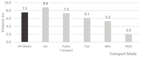 Considering Table 8 given below, which identifies by diagonal sum that about 69.2% of typical residents in Vilnius city do not undertake complex tours, it can be concluded that low travel complexity is not the main reason for poor public transport usage. However, it should be noted that complexity has the potential to increase over time and the public transport system may face additional challenges in the future as activity sequences become more complex [5,6,7] and lead to an increase in car usage [2]. Such a strong reliance on the car mode in Vilnius (distance based 75.7%) results in frequent congestion and consequently environmental and social costs such as air and noise pollution, high energy consumption, road accidents, and delays. To move towards more sustainable mobility, some proactive measures are necessary. In general, sustainable mobility is a broad definition and according to Banister [26] it encourages not only modal shift, but also the reduction of travel, and greater efficiency in the transport system.