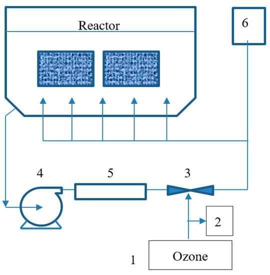 The ozonation process carried out on an ozone platform (UniLasalle, France) is shown in Figure 2. The system included two parts: (i) the ozone generator and (ii) the ozonation reactor. Ozone was generated from pure oxygen by Corona discharge (Ozat CFS3-2G, Ozonia, France) with measurement of the ozone concentration in the inlet and in off-gas (BMT, Germany). In comparison with ozone produced using dry air, ozone generated from oxygen can produce higher concentrations of ozone with the same ozonator.