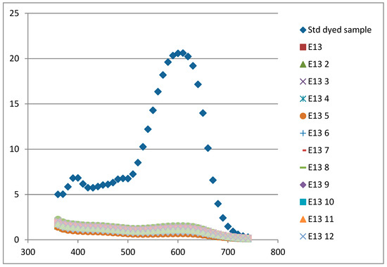 A dyed cotton sample stripped with the E13 experimental conditions (pH 5, 45 g/m3 of ozone, and treatment time of 50 min) was analyzed with a spectrophotometer. The fabric sample was scanned 20 times in 20 different areas of the same sample.