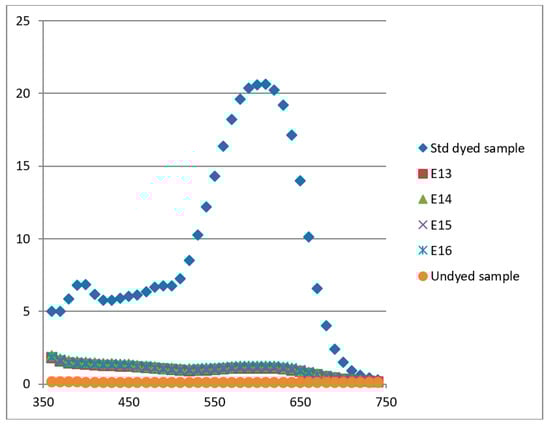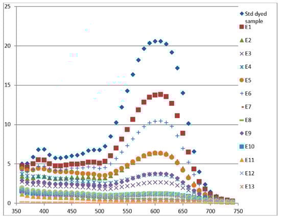 K/S spectral curves of fabrics stripped using 16 different experimental conditions are shown in Figure 6. Considerable variation of K/S values, and hence of stripping treatment, is observed as a function of experimental conditions used.