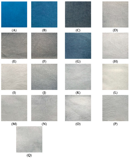 Images of the standard dyed fabric and the ozone-treated samples with different experimental parameters: (A) standard dyed fabric, (B) E1, (C) E2, (D) E3, (E) E4, (F) E5, (G) E6, (H) E7, (I) E8, (J) E9, (K) E10, (L) E11, (M) E12, (N) E13, (O) E14, (P) E15, (Q) E16.