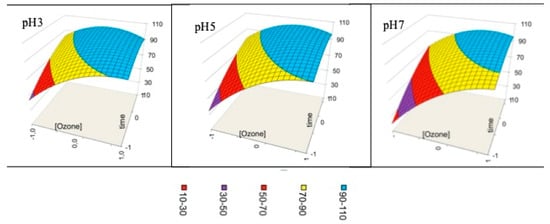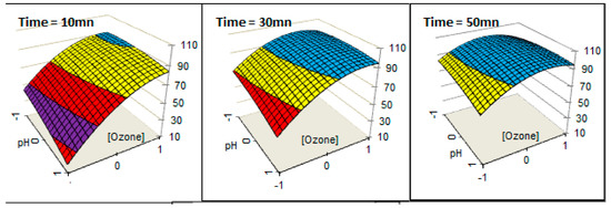 The quadratic model obtained from the Box–Behnken design generates response surface images for mutual interactive effects as a function of two variables while another variable is kept constant (Figure 8 and Figure 9). According to the coefficient factors, the concentration of ozone and reaction time have dominant positive effects in comparison with the effect of pH on the color stripping. It means that higher ozone concentration and longer reaction time lead to a better efficiency of color stripping. On the contrary, color stripping decreases with increasing pH.