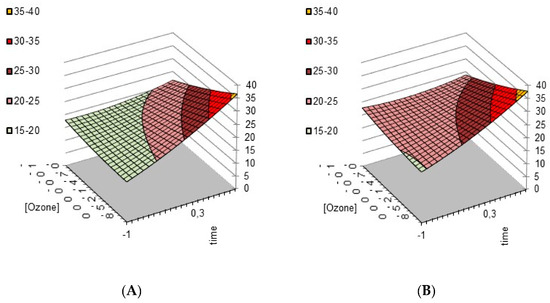 Effect of pH, [O3], and reaction time on the tensile strength loss %: (A) pH = 3; (B) pH = 7.