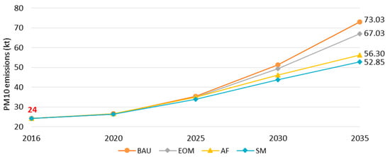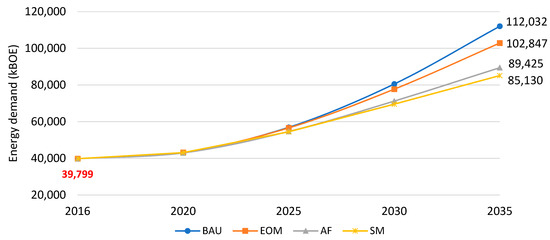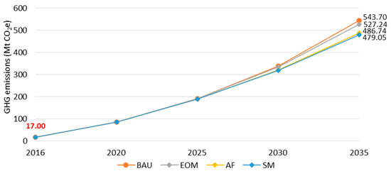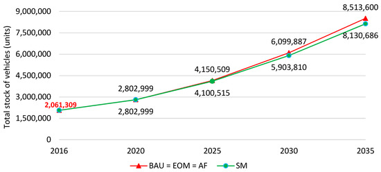 All these new projects still present uncertainty of the real impact in the future, but what is indisputable is that they are becoming increasingly important in road transport, and are present in cities these days. In this context, for the design of this scenario, it has been considered that future vehicle sales have a slight and gradual decrease, where fewer passenger private vehicles are sold each year for urban transport towards 2035. In this case, this scenario differs from the previous three, where BAU, EOM, and AF have the same global sales demand but have different percentage configurations for each vehicle’s class and fuel type that consume (see Table 3).