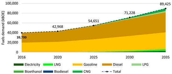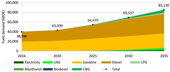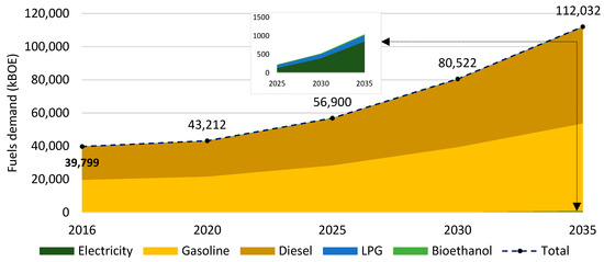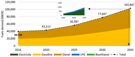 According to the National Energy Balance 2017 based on the year 2016 [39], the transport sector has the highest energy demand, which in 2007 consumed 29,314 kBOE (thousand barrels of oil equivalent) (42.60%) and grew in 2016 to 44,284 kBOE representing 48.80% of the total demand energy. In that same year, the road transport sector had the highest consumption, with 89.87% of the total demand, 39,798.6 KBOE. Liquid petroleum fuels for these vehicles were the most demanded, gasoline with 19,670.11 kBOE and diesel oil with 20,066.12 kBOE, which represent 49.42% and 50.42%, respectively, both reach the 99.84% of the total fuels demand in 2016.