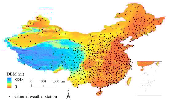 Observations of monthly Tmin, Tmax, Tmean, and PRE across China were obtained from the National Meteorological Information Center of China (http://data.cma.cn/en), and were used to evaluate the downscaled temperatures and precipitation. The dataset includes observations of 745 weather stations (Figure 1) for the period 1951–2016.