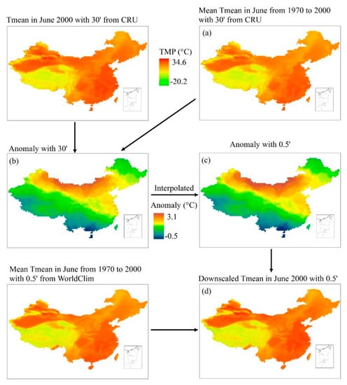 This study adopted the delta spatial downscaling framework to downscale the 30 arcmin CRU and CMIP5 datasets to a new dataset with 0.5 arcmin resolution across China to bring it to the same resolution as the reference data. Figure 2 illustrates the components and steps of the delta downscaling for Tmean using the 30 arcmin CRU time series and 0.5 arcmin WorldClim climatology datasets. The first step (Figure 2a) involves constructing a 30 arcmin CRU climatology for each month in the period 1970–2000. The second step involves calculating the 30 arcmin anomaly for a specific month relative to the long-term average for that month (Figure 2b). The Tmean anomaly was calculated as the difference between the Tmean in a specific month and the long-term averaged Tmean for that month. The PRE anomaly can be calculated as the ratio of the PRE in a specific month to the long-term averaged PRE for that month. The third step involved spatial interpolation of the 30 arcmin anomaly to the 0.5 arcmin WorldClim grid (Figure 2c). The final step (Figure 2d) involved transformation of the 0.5 arcmin anomaly to the 0.5 arcmin Tmean for that month using the WorldClim climatology for the corresponding month. This transformation reversed the creation of the anomaly; therefore, addition was used for Tmean, while multiplication was used for PRE. It should be noted that the bilinear interpolation method was applied for the interpolation of the anomaly, which has been found to have good performance in the delta downscaling process [24,28].