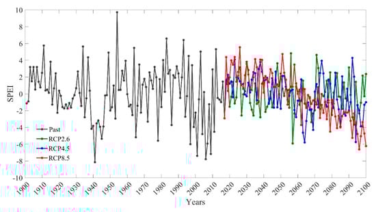 Annual SPEI changes during the past (1901–2017) and future (2018–2100) periods. The future trajectory under each RCP scenario is the averaged result of BNU-ESM, CESM1-CAM5, and GFDL-ESM2M.