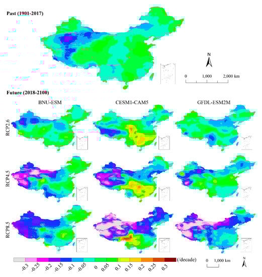 Spatial patterns of trends in annual SPEI variations during past (1901–2017) and future (2018–2100) periods.