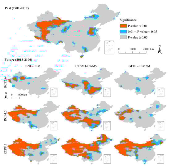 Spatial patterns of trend significance in annual SPEI variations during past (1901–2017) and future (2018–2100) periods.