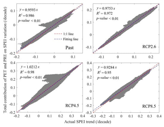 Before determining the contributions of PET and PRE to the SPEI variability, the linear regression relationship of their interannual variations expressed using Equation (2) was evaluated (Figure S7). The determination coefficient (R2) and p-value at each grid across China suggested that Equation (2) is a good fit for the data and that the SPEI variation could be completely separated into the PET and PRE variations. The contributions of PET or PRE were calculated based on the regression coefficients at each grid point. Figure 6 shows the comparison between the actual SPEI trends and the total contributions of PET and PRE to SPEI variability during the past and future periods across China. The statistic result showed that the total contribution is very close to the actual SPEI trends, suggesting that this approach to calculating the PET and PRE contributions to SPEI variability is reasonable.