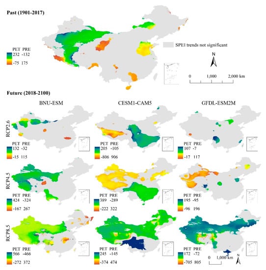 Comparison between the actual SPEI trends (x) and the total contribution of potential evapotranspiration (PET) and PRE on SPEI variations (y) for past (1901–2017) and future (2018–2100) periods across China. The total contribution under each RCP scenario is the averaged result of BNU-ESM, CESM1-CAM5, and GFDL-ESM2M.
