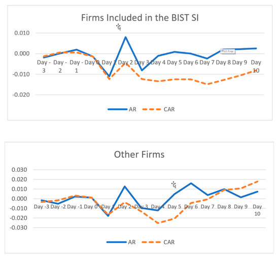 Studies held for the Turkish market mostly concentrate on a single dimension of market performance. Çıtak et al. [35] investigated investors’ reaction to the announcement of companies included in the BIST SI by comparing the stock returns of 50 BIST companies which are constituents of that index with those of BIST 50 companies that are not included in the index between November 2015 and October 2016. They found no significant difference between the returns of these two groups, except for the interval of 0 to +4 days until +10 days, where there was significant cumulative abnormal return (CAR) for those firms included in the BIST SI.