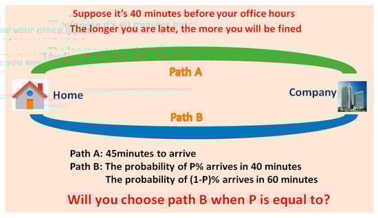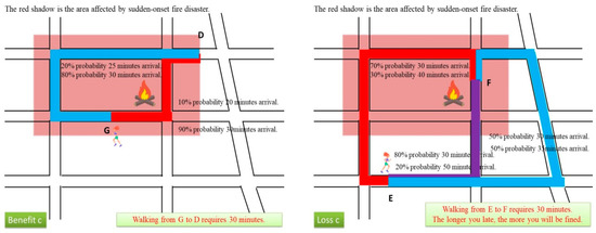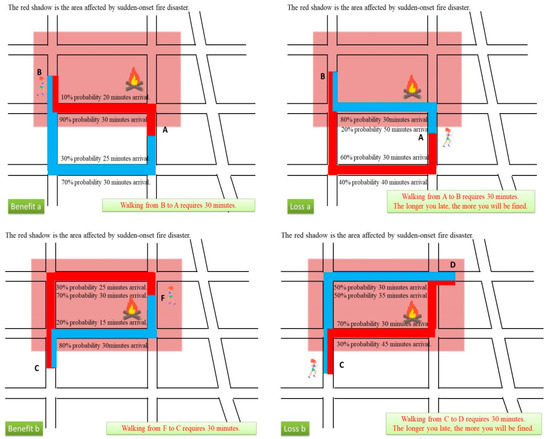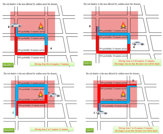 Scenario 2: Assuming that the traveler has two paths to choose from the designated starting point to the designated destination (path A and B, one of which passes through the fire area), the travel time of the two paths is the same. The travel time of the two paths increases because of the traffic congestion around the fire. In this case, we think the traveler is loss. The travel time of path A is () and the corresponding probability is (), the travel time of path B is (), and the corresponding probability is ().
