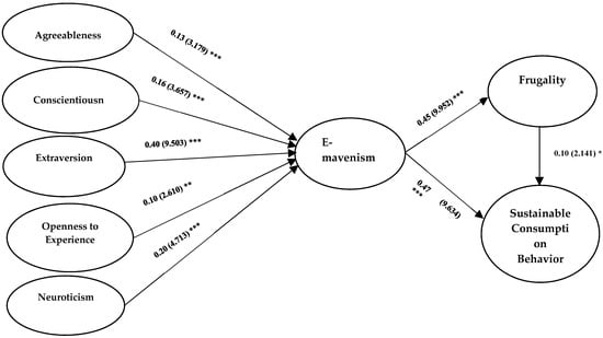 Materialistic lifestyle, along with the increase in the world’s population, is leading to unlimited hyper-consumption due to raising the global demand for services and goods. Marketing strategies can be acclimatized to offer more viably to the vital segment of buyers by engaging e-mavens, their antecedents of big five personality traits, frugality, and sustainable consumption behavior are needed to comprehend. The study assessed the novel endeavor to exhibit a potential relationship among the big five, e-mavenism, frugality, and sustainable consumption behavior in social networking sites. This body of knowledge adds to comprehend sustainable consumption behavior and fills many gaps by using data from a sample (n = 387) of social networking sites users from China. Causal modeling technique (SEM) is affianced to evaluate the study hypotheses. The data from an online survey disclose a positive association of agreeableness, conscientiousness, extraversion, neuroticism, and openness to experience with e-mavenism. The results affirm that e-mavenism is positively correlated with frugality. Moreover, frugality is vital in the growth of sustainable consumption behavior as well. Eventually, e-mavenism positively influences sustainable consumption behavior. These results enhance understanding of sustainable consumption behavior and provide an opportunity that marketing managers may apply these constructs into their strategies to achieve competitive advantage.