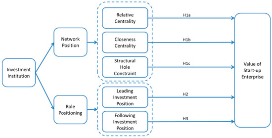 For the measurement of the network position of joint venture capital, the relative importance of the members in the network is measured by calculating the network centrality and structural holes, which is the network position. In a venture capital network, the closer to the network center the network position of investment institution is, the more significant impact on investment efficiency it will have, and the more obvious promotion of information and resource advantages established through network connection on start-up enterprises it will produce [12]. The control power of network members in the network is measured and their utilization efficiency of network resources is reflected through structural holes. The investment institution which occupies more structural holes can help its supporting start-up enterprises to obtain more resources and information [25]. The venture capital institution which is in structural holes controls the path of information transmission and resource allocation and plays a significant role in promoting knowledge transfer and cooperative innovation [26]. There are many centrality indicators, and the joint venture capital network structure can be described in terms of influence, control ability, and communication ability. Therefore, the relative centrality, closeness centrality, and structural hole constraint are selected as the indicators to measure the network position of investment institutions. The higher relative centrality and closeness centrality an investment institution has, the stronger influence and control it will have in the network, and the more development of start-up enterprises it can promote. The less restrictive the structural holes of the investment institution are, the more structural holes it will occupy, the stronger ability to communicate in the network it will have, as well as the more positive impact on start-up enterprises it will have. Therefore, based on H1, three sub-hypotheses are proposed: