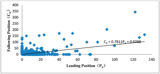 Figure 3 is about the leading position and following position of investment institutions in the joint venture capital network. The larger the value of is, the more obvious the leading position of investment institutions is; the larger the value of is, the more obvious the following position of investment institutions is. The line in the figure is = 0.7811 + 0.6088. Additionally, for the part below the line, it shows < 0.7811 + 0.6088, which means the obvious leading position of investment institutions. From the establishment of the start-up enterprises, these institutions have participated in the management of the start-up enterprises, and then other investment institutions also gradually participate.
