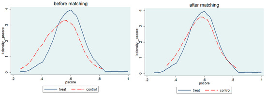 Figure 4 shows probability density functions of two groups’ propensity scores after the nearest neighbor matching method. It can be seen that before matching, the probability density distributions of the propensity scores between the control group and the treatment group are significantly different, which indicates that the characteristics of two groups of start-up enterprises vary greatly, and the investment preferences of investment institutions also will be affected by the characteristics of start-up enterprises. After matching, the propensity scores of the control group and the treatment group have a more consistent probability density distribution, indicating that the characteristics of the two groups of enterprises are similar, which reduces the impact of the investment preferences of investment institutions on the research results.